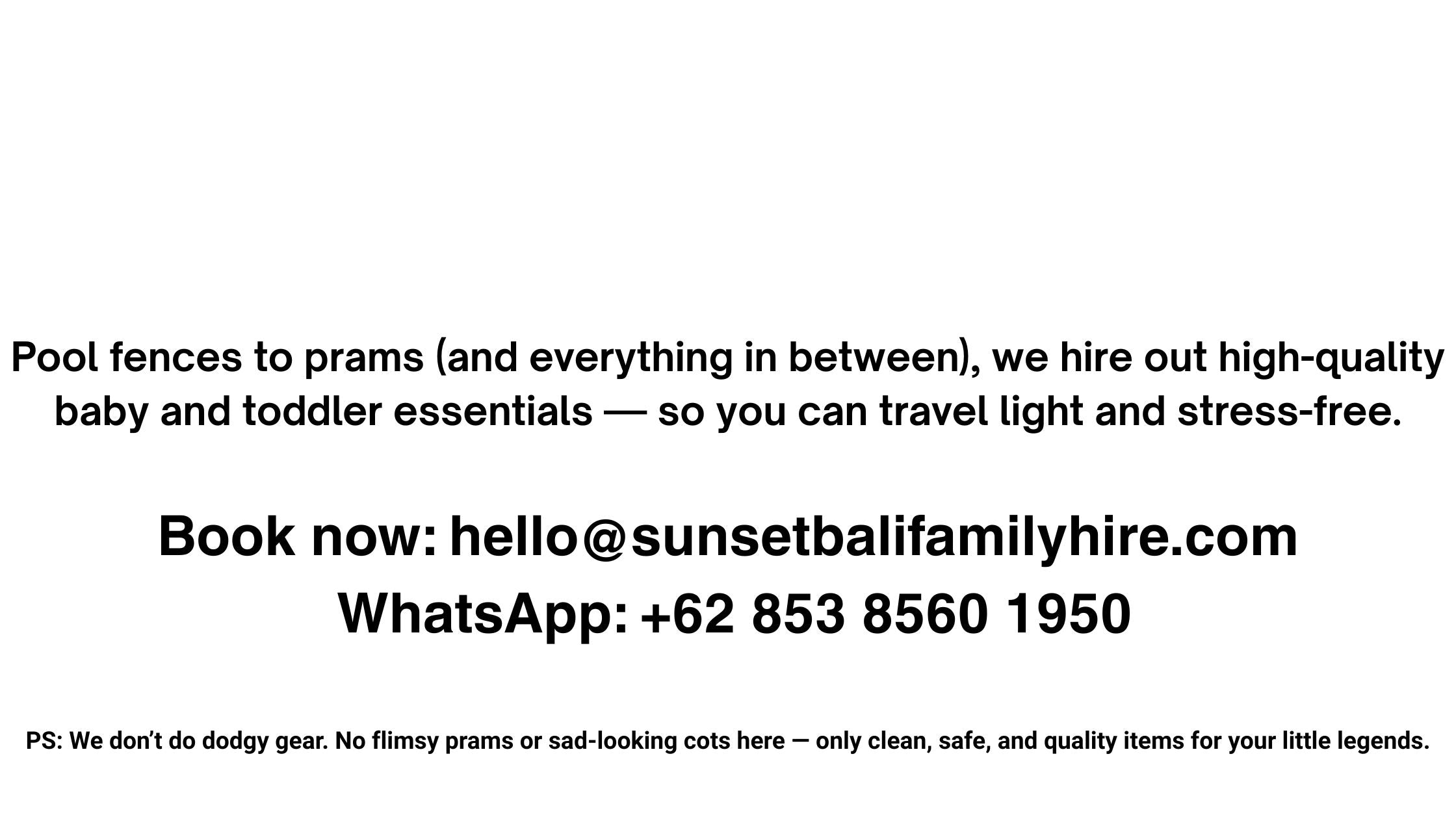 Sunset Bali Family Hire provides all the hire items you need for a safe, easy, and fun holiday—delivered right to your villa or hotel, all over our beloved island of Bali.